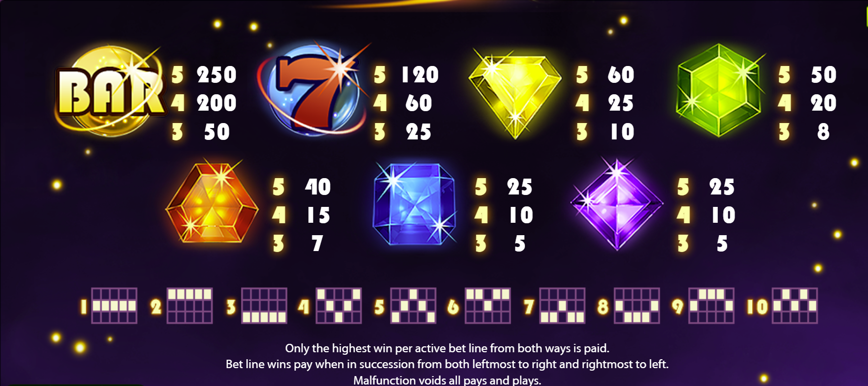 - Gem symbols (various colours) lower-to-mid payouts depending on alignment. :contentReference[oaicite:9]{index=9}